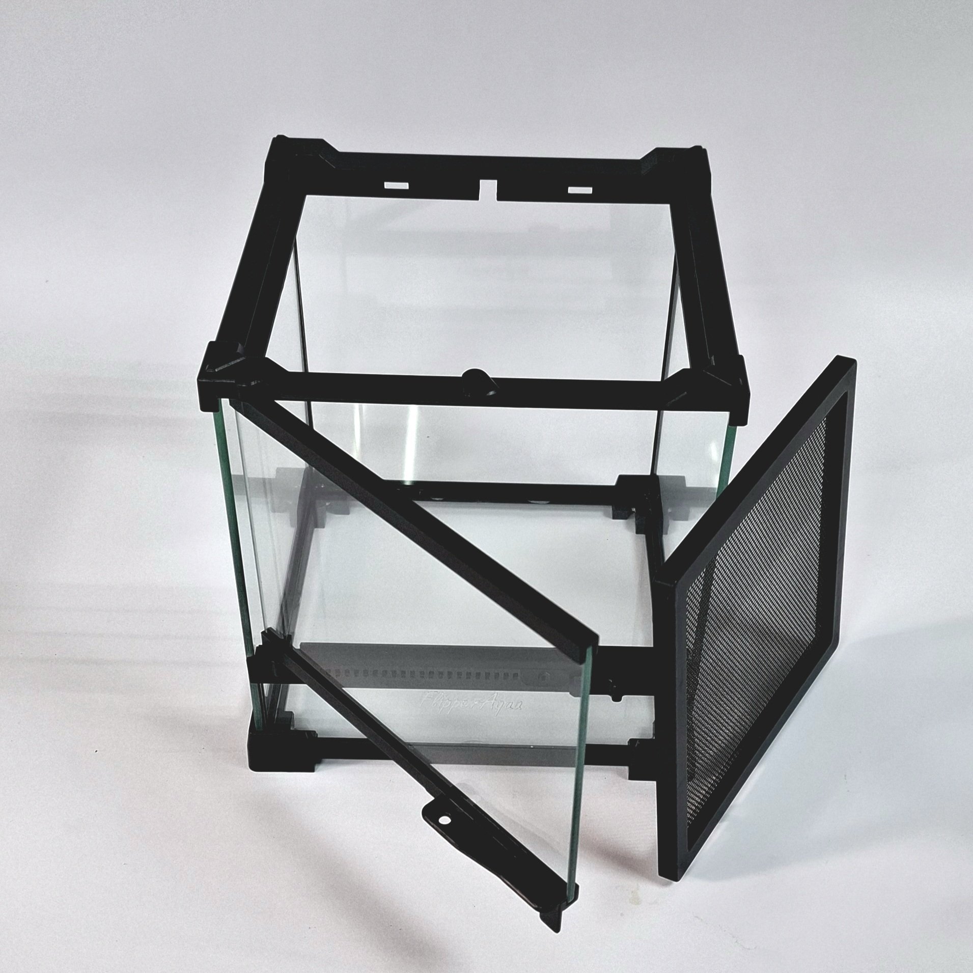 Террариум 20х20х20 имеет одну распашную дверку, замок-защелка, вверху мелкая сетка, и вентиляция под дверкой. верхняя сетка также снимается, что удобно при эксплуатации.