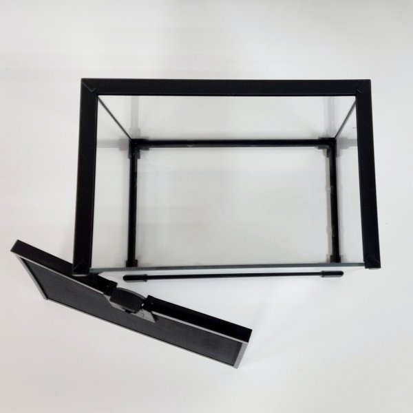 террариум имеет вентиляционную верхнюю сетку, с открывающимся лючком для кормления.
