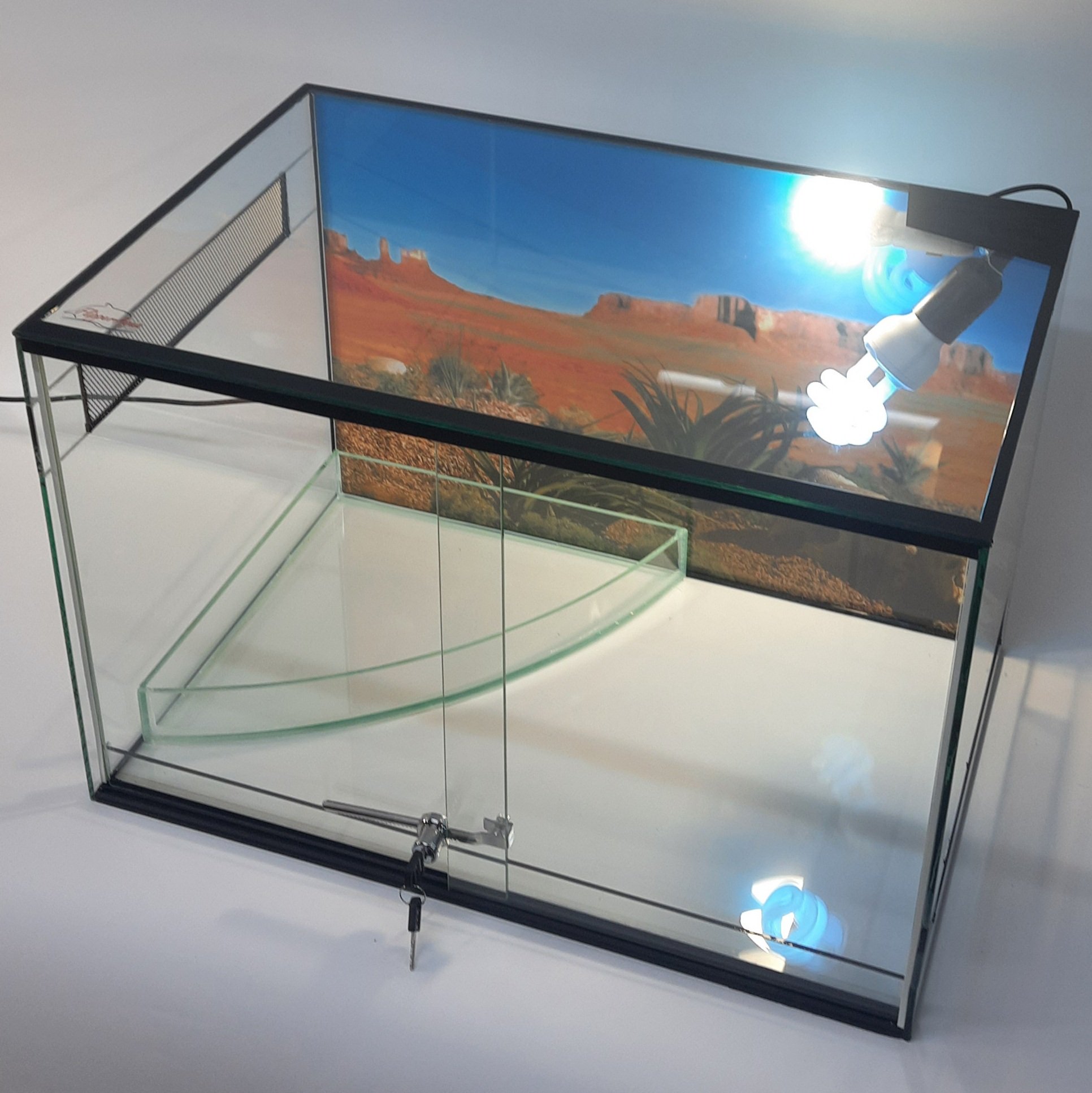 В террариуме для рептилий придуманная вентиляция, которая способствует правильному воздухообмену. Встроенные патроны обеспечивают удобное подключение необходимого освещения и ламп.