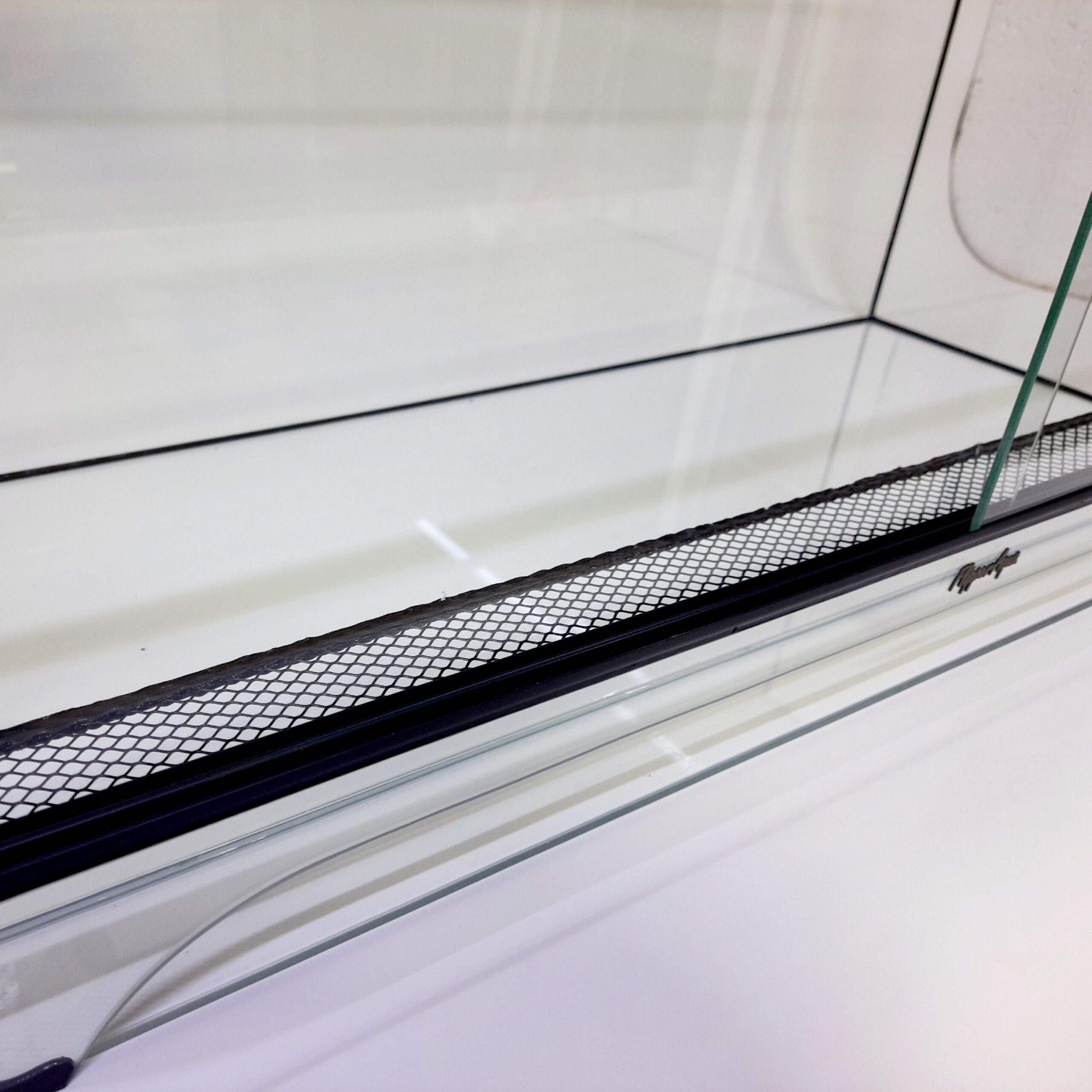 террариум с фронтальный вентиляцией 80х35х40. сетка расположена под раздвижными дверцами. устроено таким образом что субстрат не высыпается через сетку.