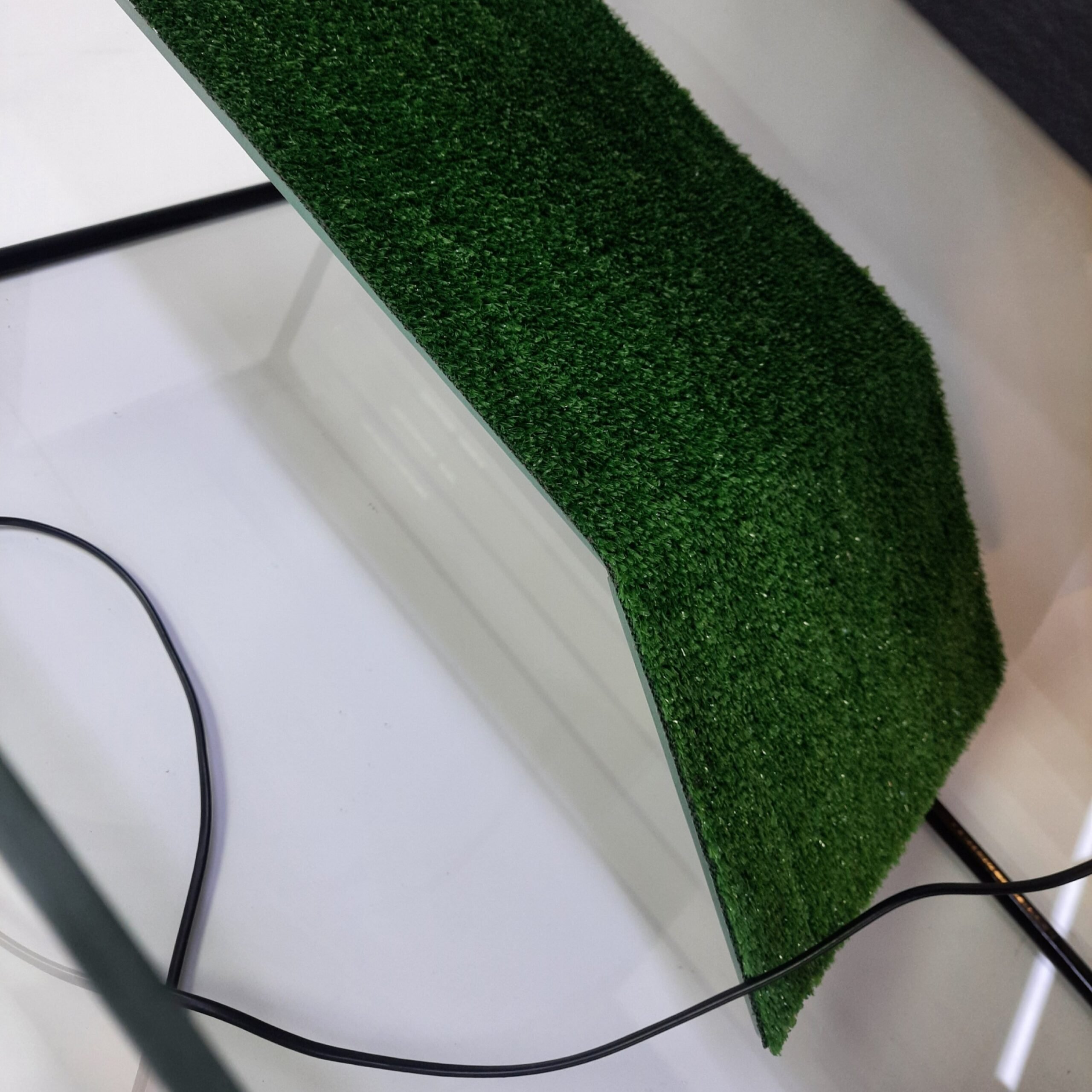 террариум для водоплавающих (красноухих черепах, болотных черепах) черепах с островком покрытый искусственной травой. В крышке встроено два патрона е27, один для УФ лампы, один для греющей (мощность не более 40Вт). и два патрона е14 для освещения.