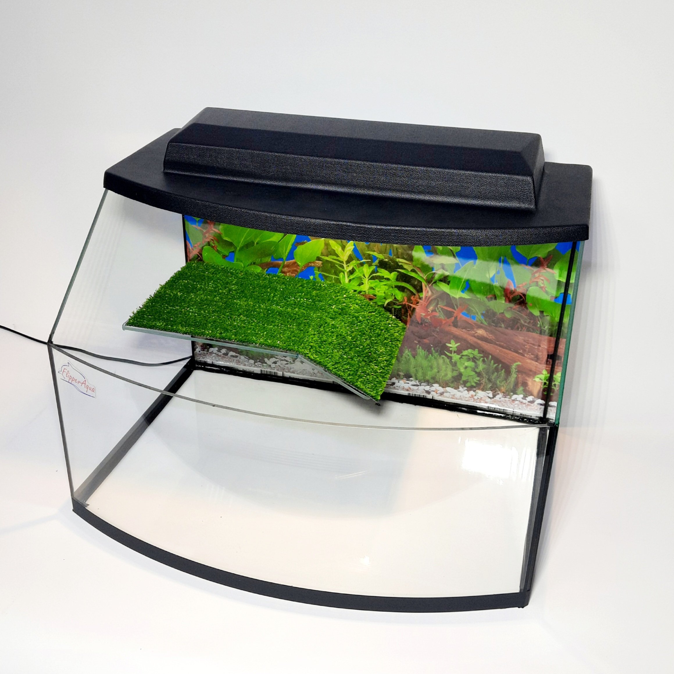 В комплекте террариум поставляется с крышкой, в крышке имеется патрон е14 (под светодиодную или энергосберегающую лампу), островок покрыт зеленой искусственной травой.