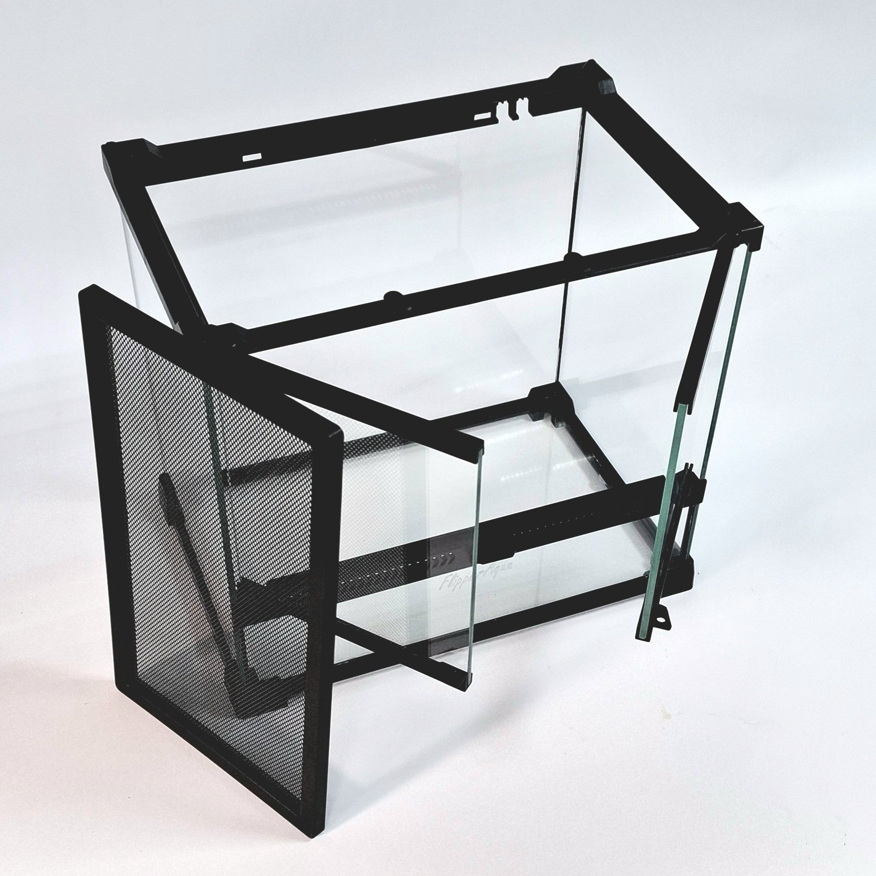 террариум 30х20х25 имеет две распашные дверцы на замке, съемную верхнюю сетку с мелкой ячейкой, также для правильной вентиляции имеются отверстия под дверцами.